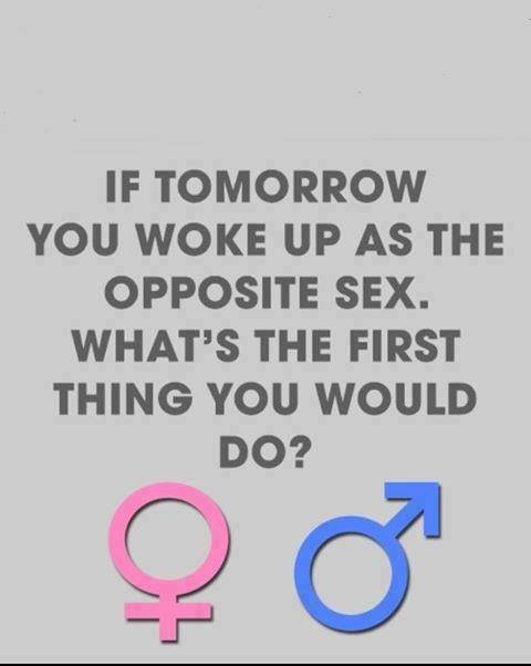 I was playing on Pinterest when I ran across the image on the right. If tomorrow you woke up as the opposite sex, what’t the first thing you would do? The grammatical errors notwithstanding, it got me thinking, what would I do?